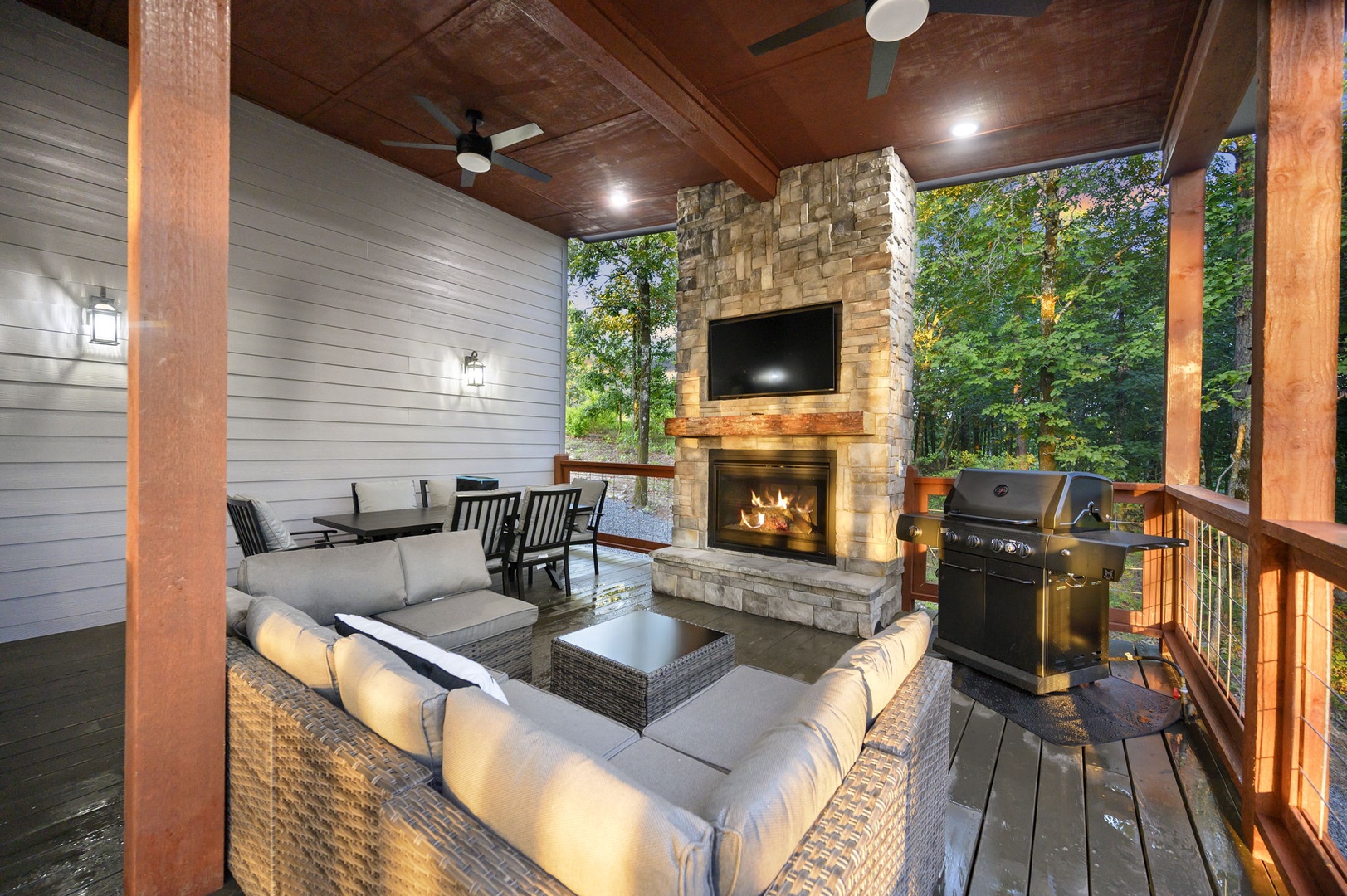 Cozy evenings: Two gas fireplaces—inside the living room and outside on the back deck.