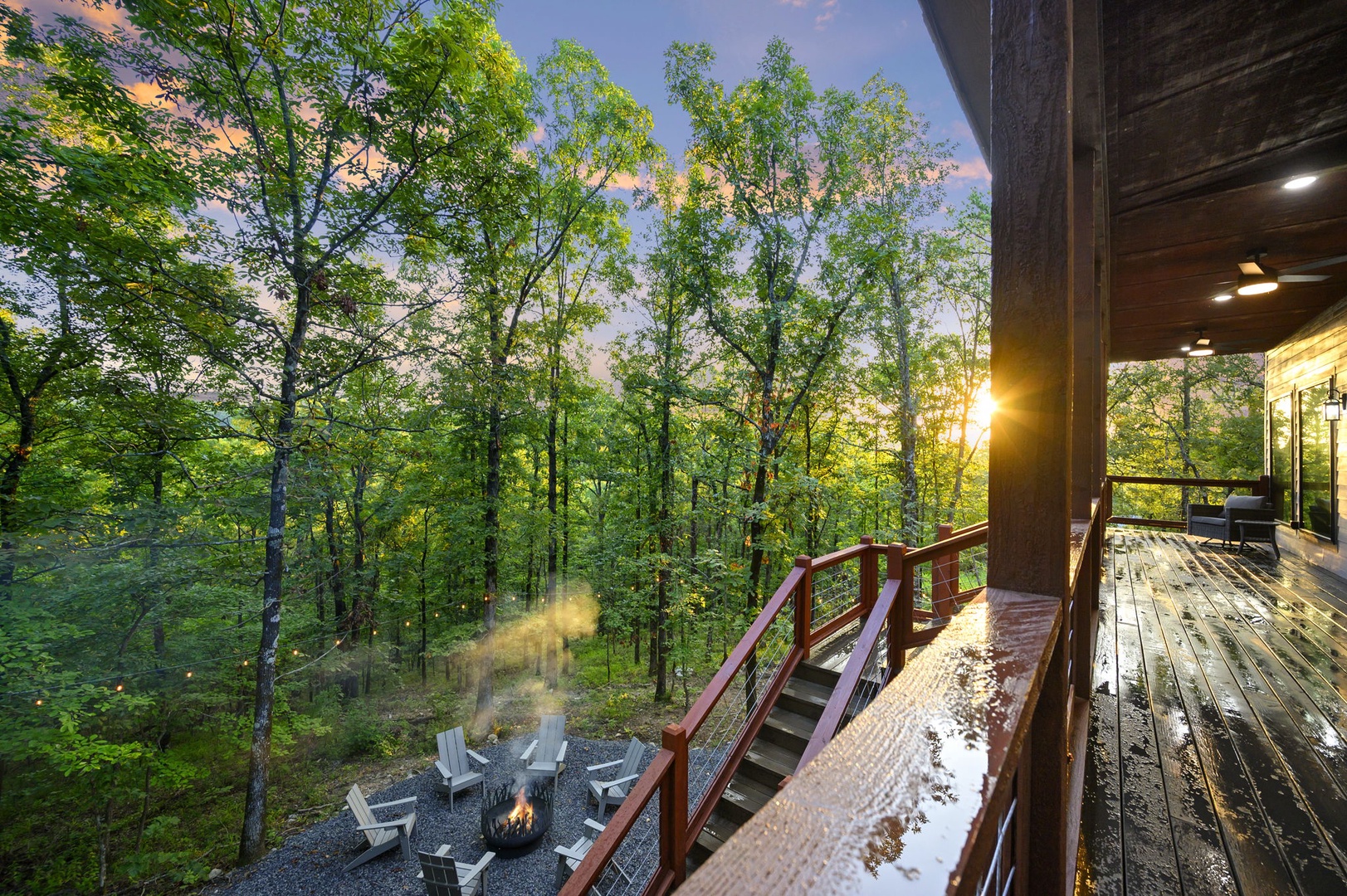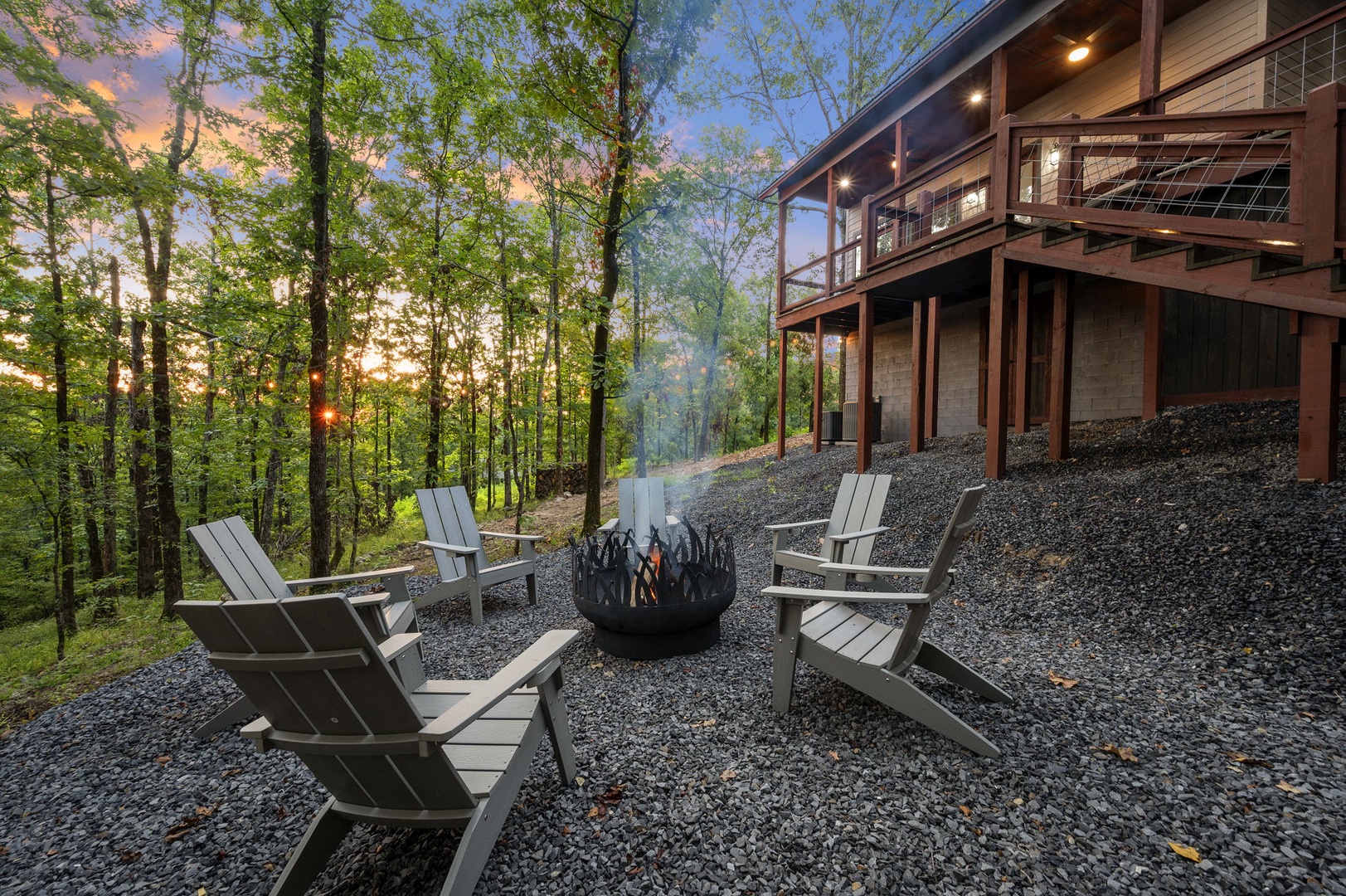 Outdoor relaxation: Private setting with oversized deck overlooking native hickory and pine trees, Jacuzzi spa, and a ground-level fire pit for s’mores under the stars.