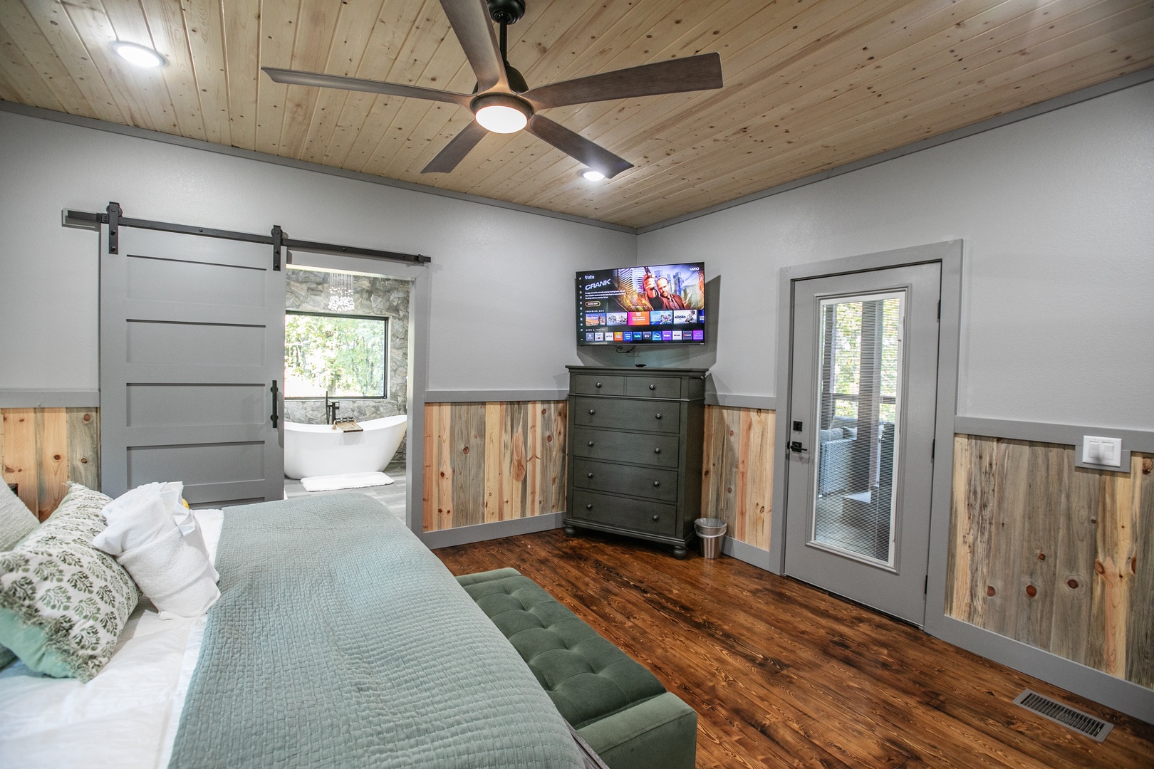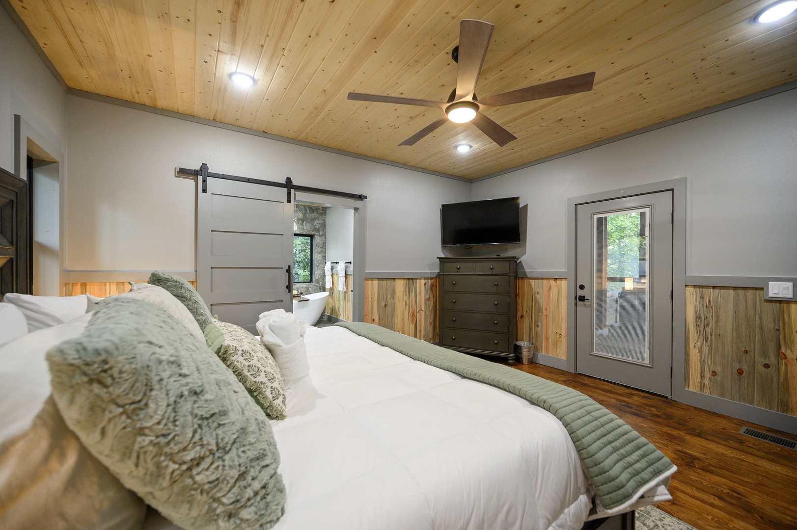 Primary King Suite (Downstairs): Features an en suite bathroom with a spacious, handicap-friendly walk-in shower (with bar and bench, no roll-in), plus a luxurious soaking tub and double vanity.