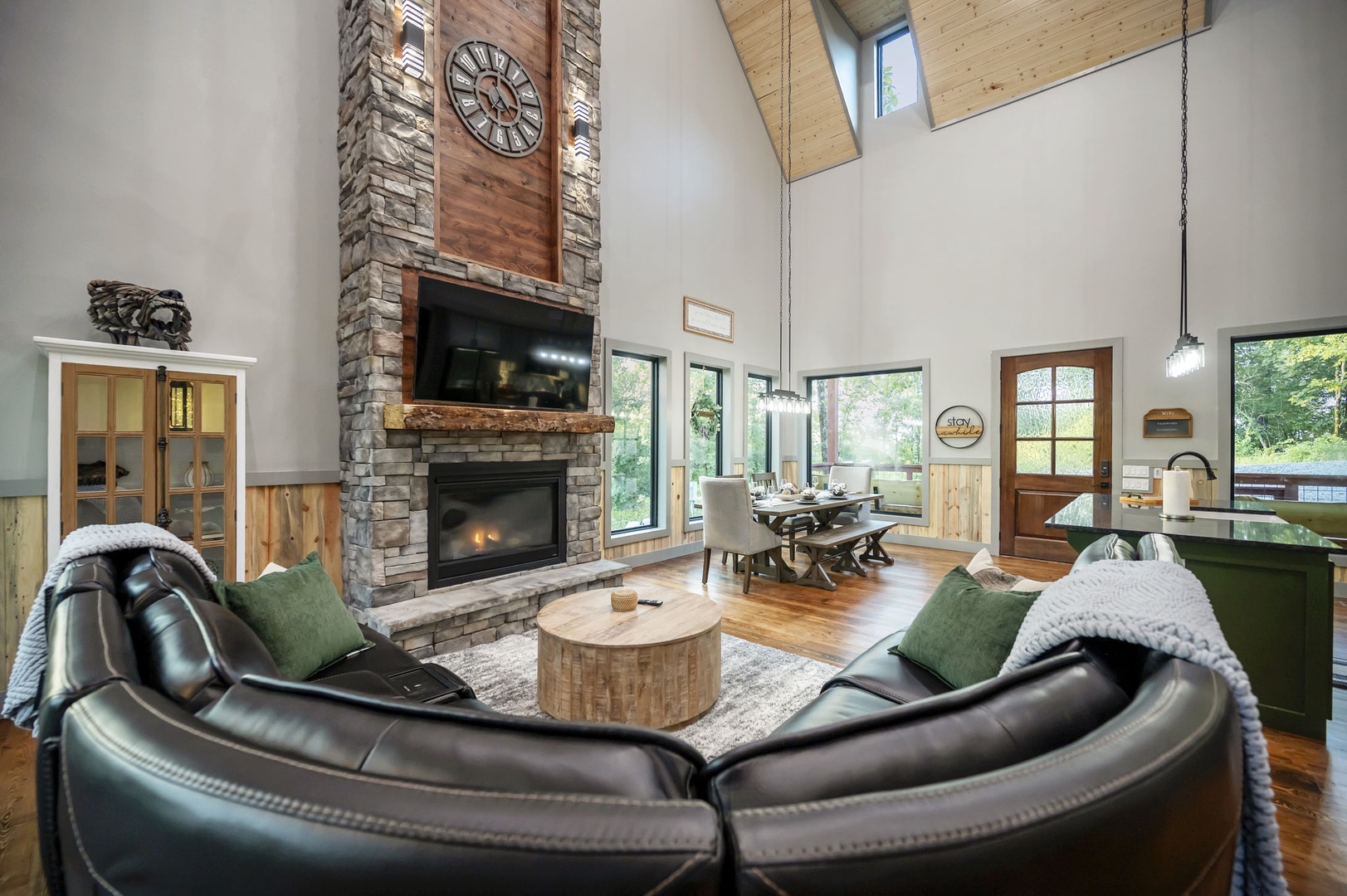 Open-concept fully furnished kitchen, dining, and living space with a warm, welcoming atmosphere.