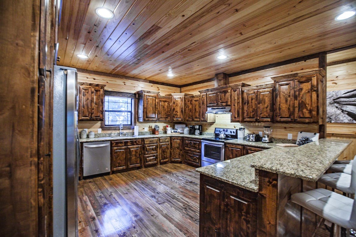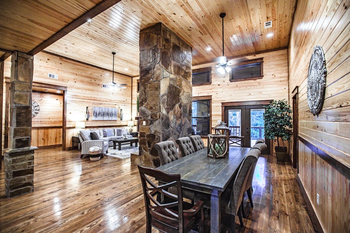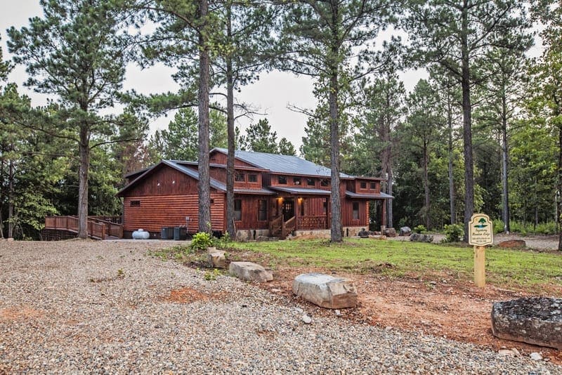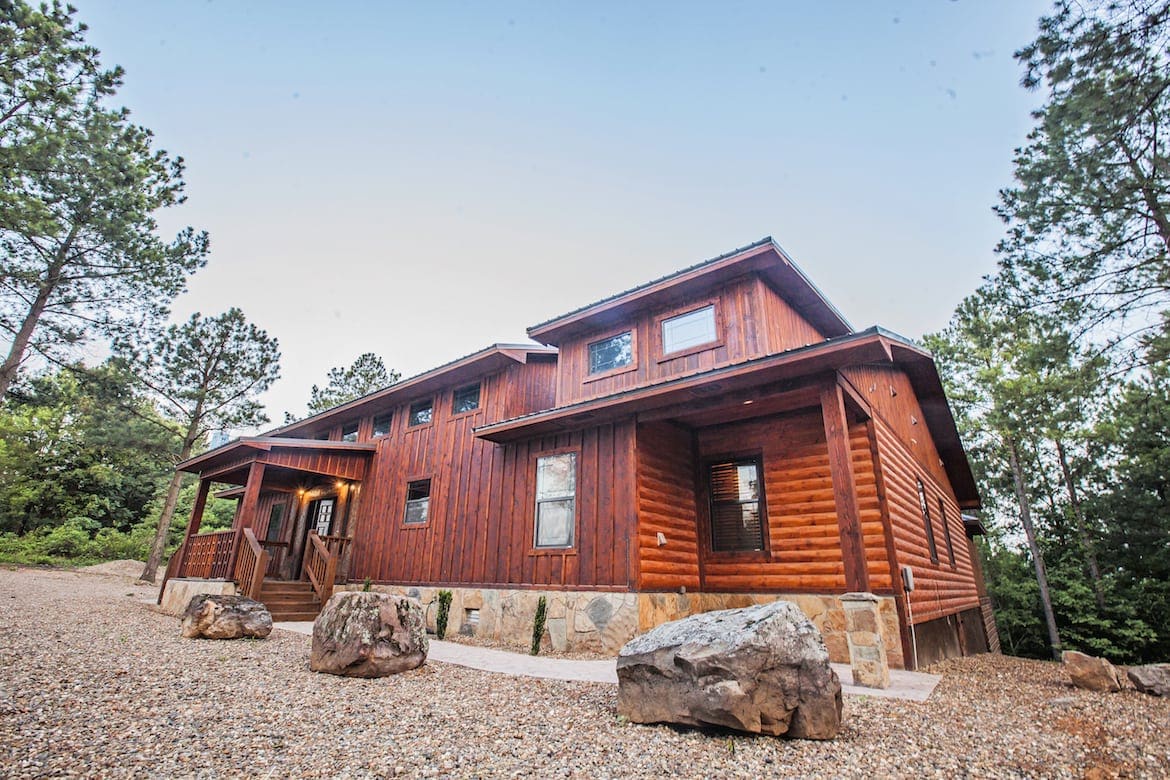 Sugarberry Mountain Lodge 4 BR/Sleeps 10/4 king/1 Inflatable Mattress/4.5 Bath. Sugarberry Mountain Lodge is located in the beautiful Timber Creek Trails just a few minutes from Broken Bow Lake and Beavers Bend State Park. Also, near Mountain Fork Brewery, Knotted Rope Winery, Hochatown Distilling, and Shuck Me restaurant. Sugarberry was built and professional decorated with luxury and comfort in mind. Each King bed includes luxury Downlite Brand Linens. The back patio has a sitting area situated around the outdoor wood burning fireplace, a large hot tub and a large dining table for outdoor dining, also a gas grill for cooking outdoors. The cabin is perfect for 4 adult couples or a large family gathering including kids! • NO PETS • NO SMOKING