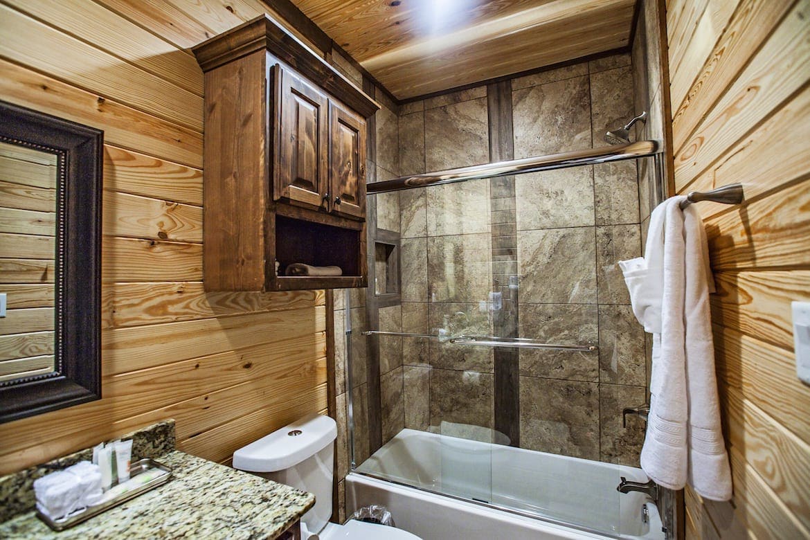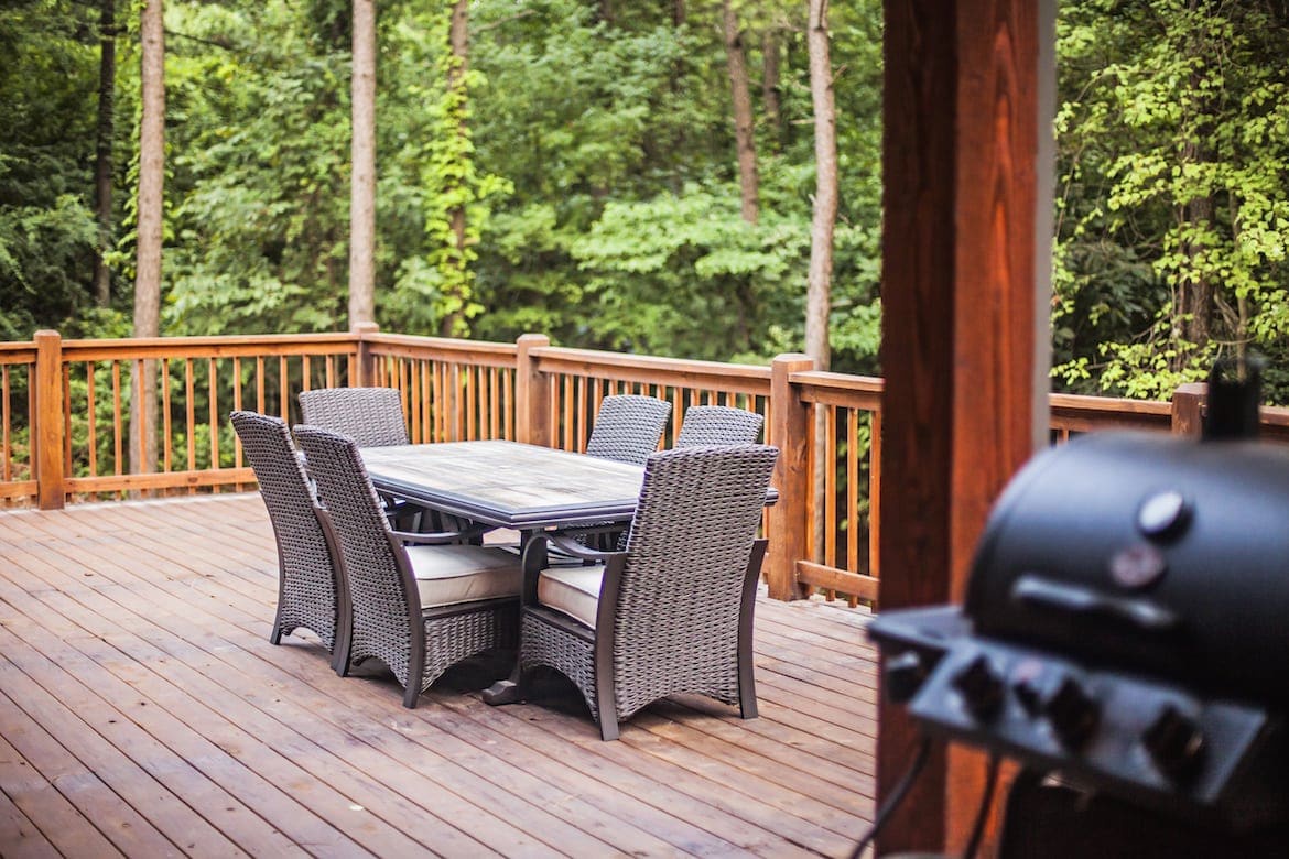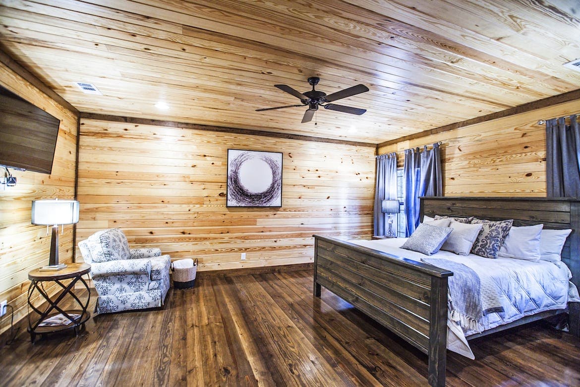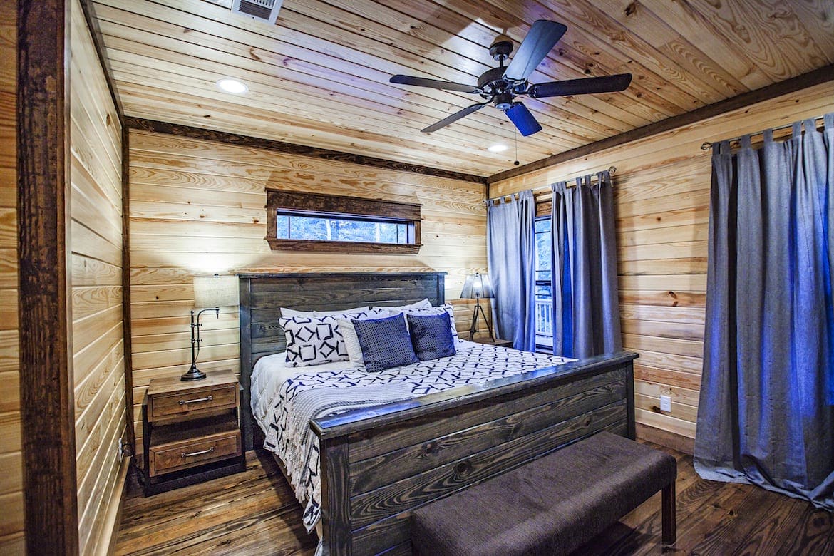 Sugarberry Mountain Lodge 4 BR/Sleeps 10/4 king/1 Inflatable Mattress/4.5 Bath. Sugarberry Mountain Lodge is located in the beautiful Timber Creek Trails just a few minutes from Broken Bow Lake and Beavers Bend State Park. Also, near Mountain Fork Brewery, Knotted Rope Winery, Hochatown Distilling, and Shuck Me restaurant. Sugarberry was built and professional decorated with luxury and comfort in mind. Each King bed includes luxury Downlite Brand Linens. The back patio has a sitting area situated around the outdoor wood burning fireplace, a large hot tub and a large dining table for outdoor dining, also a gas grill for cooking outdoors. The cabin is perfect for 4 adult couples or a large family gathering including kids! • NO PETS • NO SMOKING