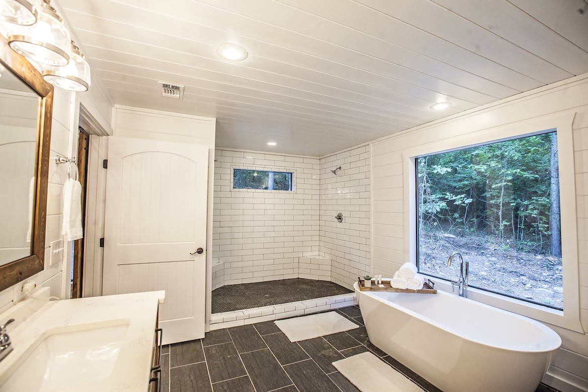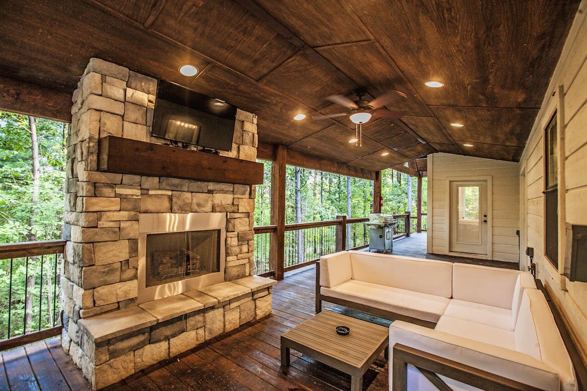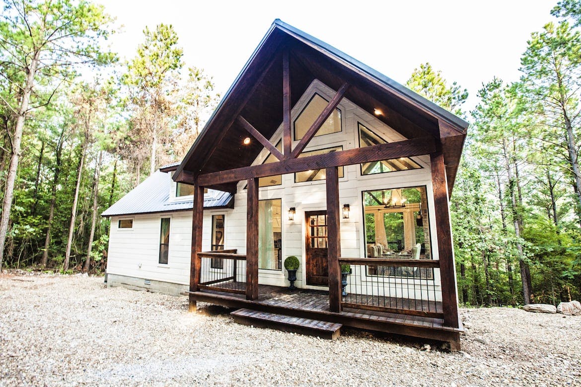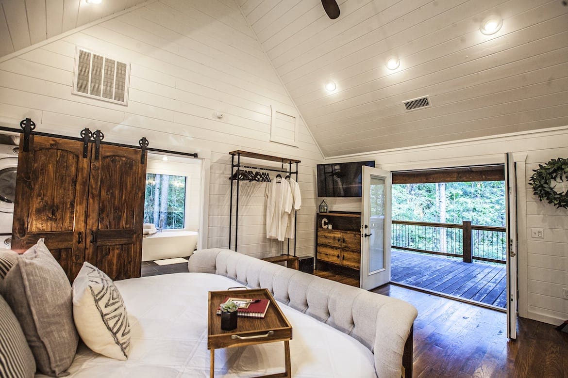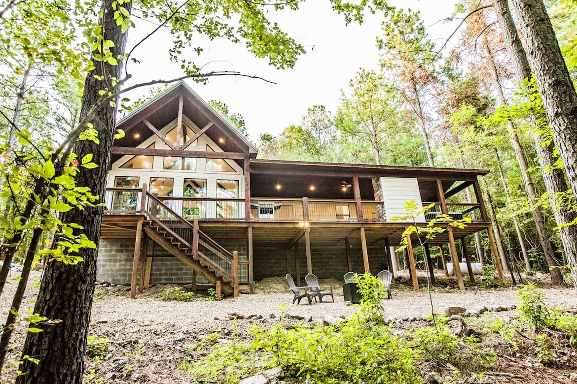 The Caroline 1 BR/Sleeps 4/1 King/1 Inflatable Mattress/1 Bath. The Caroline is the ultimate luxury retreat, with no detail overlooked. This hillside cabin makes a perfect romantic getaway for two, or a nice retreat for small families. Ten-foot ceilings and oversized windows feature hillside views and bring the outdoors right into the living areas. The natural wood beams and shiplap are inspired by the modern farmhouse movement and provide a relaxing and romantic atmosphere. The master bedroom features a king size bed, vaulted ceilings, and a walkout to the covered deck. An oversized bed with luxurious textiles makes this the perfect spot to read a book or watch a movie. The sleek bathroom offers a private oasis with a large walk-in shower featuring dual showerheads and an oversized soaking tub. Our spacious outdoor patio is located off the master bedroom with access from the living area as well. At 15 feet above ground level, the patio overlooks the hillside and pine trees. The patio is equipped with a large hot tub, beautiful stone gas fireplace, lounge, dining, and grilling areas. Below the deck is an area for lawn games and a wood burning fire pit perfect for smores. The cabins' location and long entry drive provide plenty of privacy for your ultimate getaway. This smart cabin features voice-controlled lights and thermostat, a digital cabin guide powered by Amazon Echo. State of the art 4K ultra high-definition TVs with surround sound and streaming services in both the master bedroom and living area are perfect for movie nights or sporting events. • NO PETS • NO SMOKING
