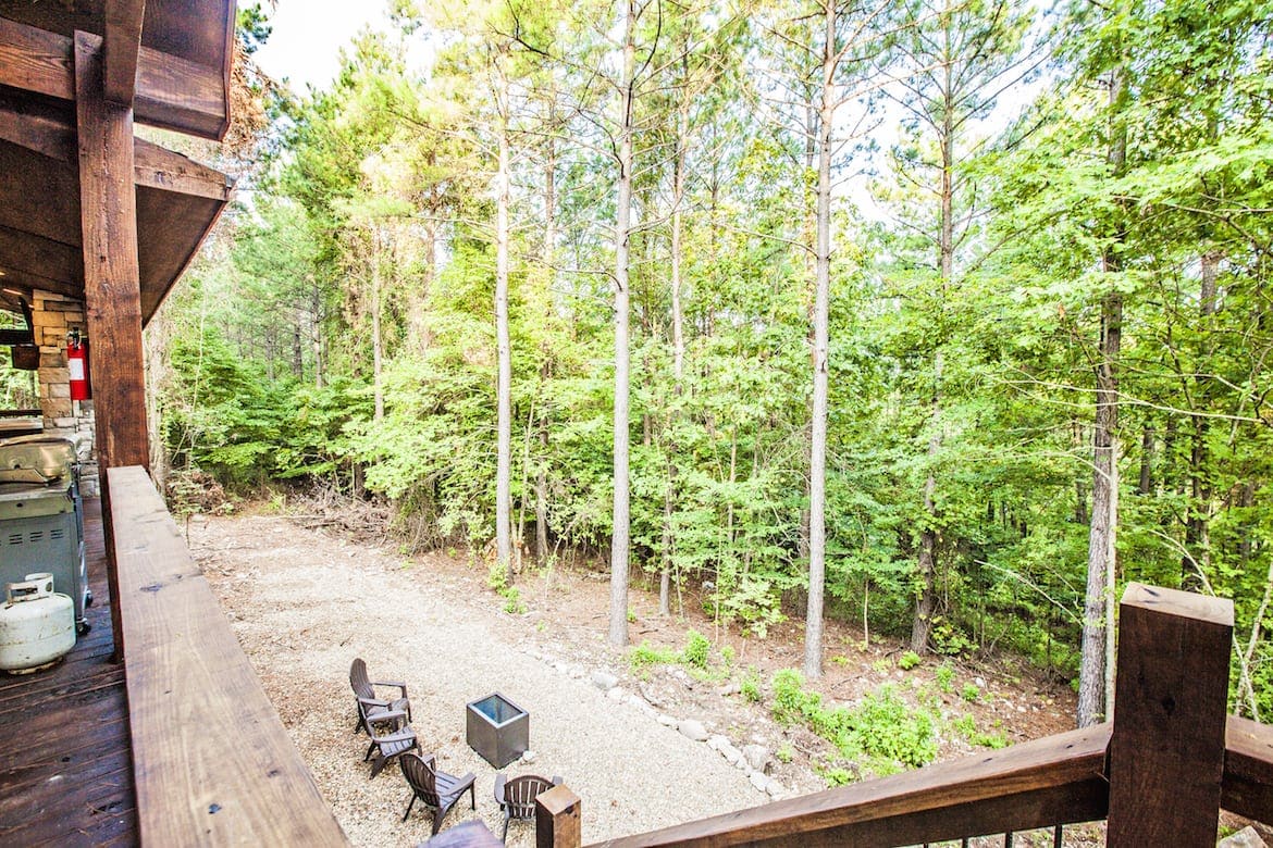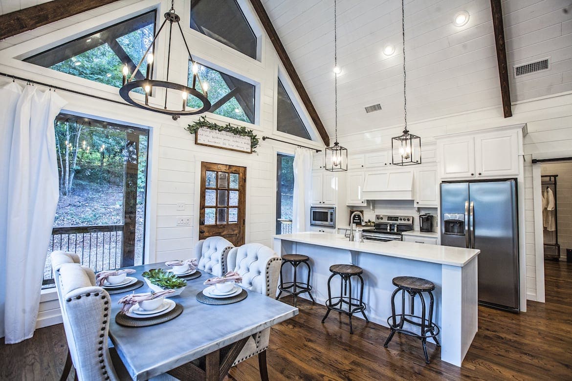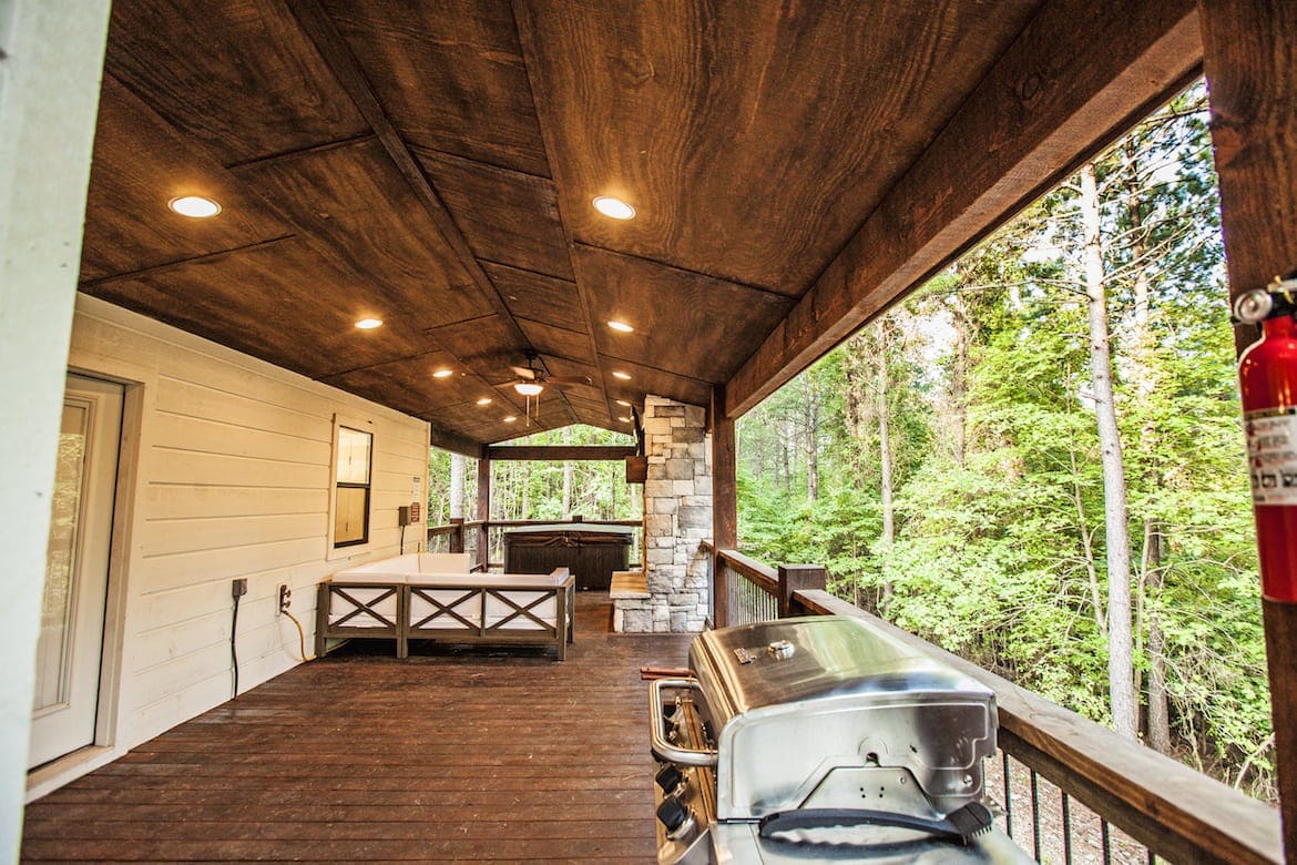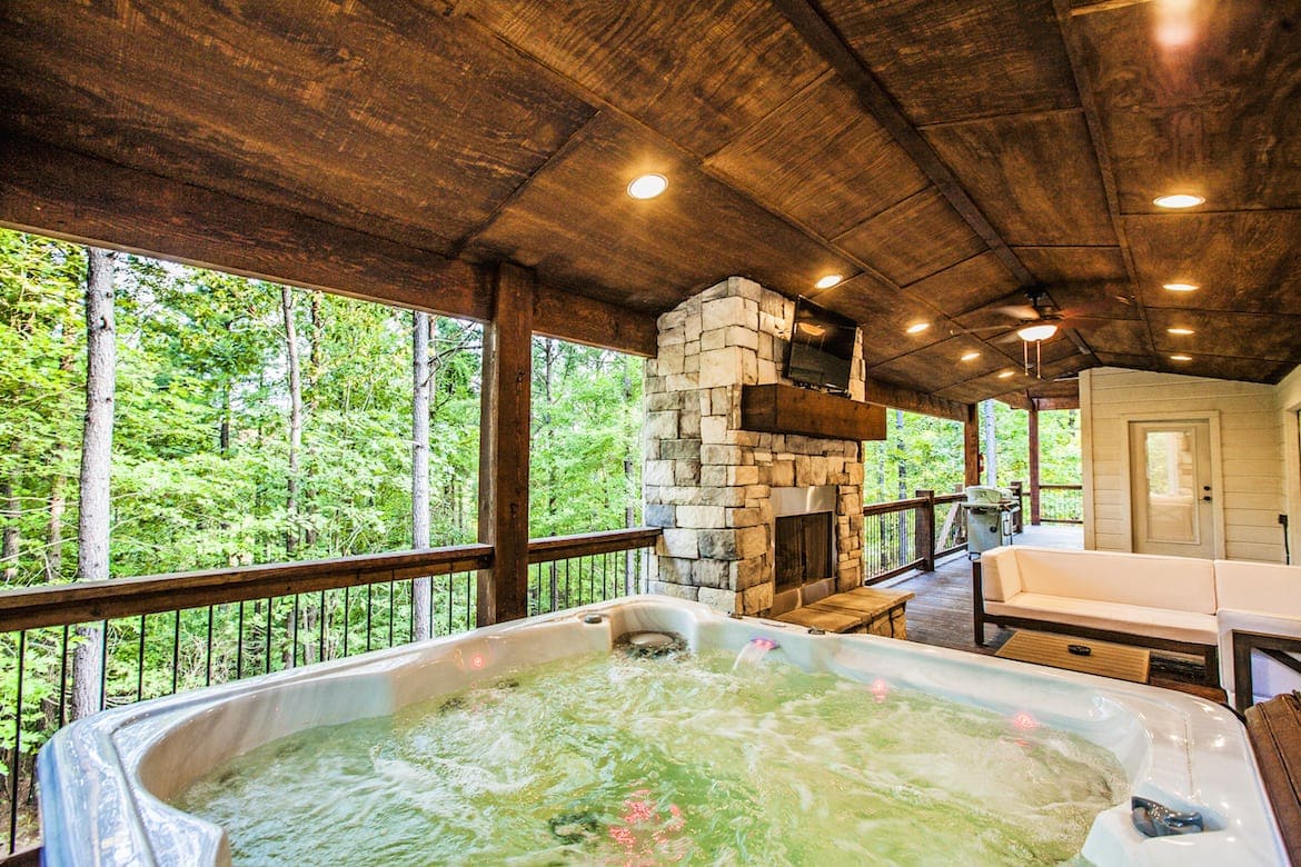 The Caroline 1 BR/Sleeps 4/1 King/1 Inflatable Mattress/1 Bath. The Caroline is the ultimate luxury retreat, with no detail overlooked. This hillside cabin makes a perfect romantic getaway for two, or a nice retreat for small families. Ten-foot ceilings and oversized windows feature hillside views and bring the outdoors right into the living areas. The natural wood beams and shiplap are inspired by the modern farmhouse movement and provide a relaxing and romantic atmosphere. The master bedroom features a king size bed, vaulted ceilings, and a walkout to the covered deck. An oversized bed with luxurious textiles makes this the perfect spot to read a book or watch a movie. The sleek bathroom offers a private oasis with a large walk-in shower featuring dual showerheads and an oversized soaking tub. Our spacious outdoor patio is located off the master bedroom with access from the living area as well. At 15 feet above ground level, the patio overlooks the hillside and pine trees. The patio is equipped with a large hot tub, beautiful stone gas fireplace, lounge, dining, and grilling areas. Below the deck is an area for lawn games and a wood burning fire pit perfect for smores. The cabins' location and long entry drive provide plenty of privacy for your ultimate getaway. This smart cabin features voice-controlled lights and thermostat, a digital cabin guide powered by Amazon Echo. State of the art 4K ultra high-definition TVs with surround sound and streaming services in both the master bedroom and living area are perfect for movie nights or sporting events. • NO PETS • NO SMOKING