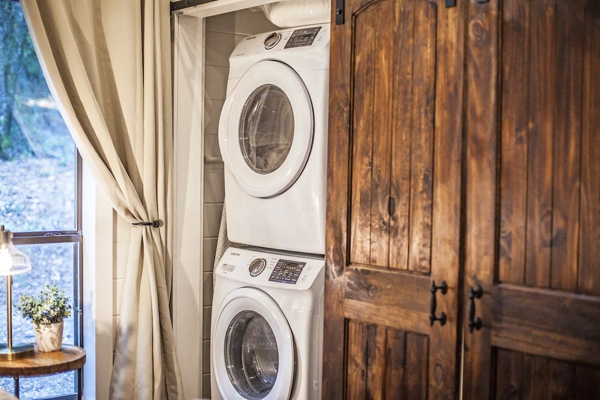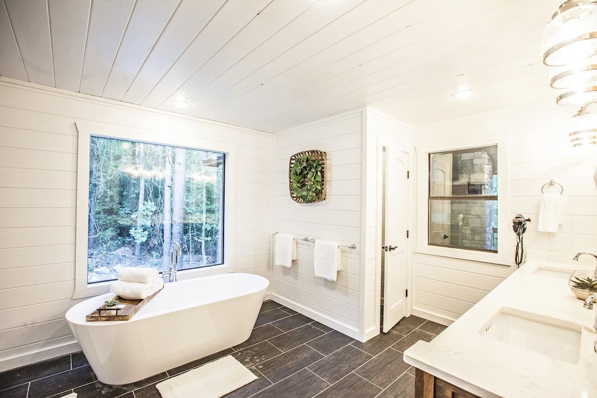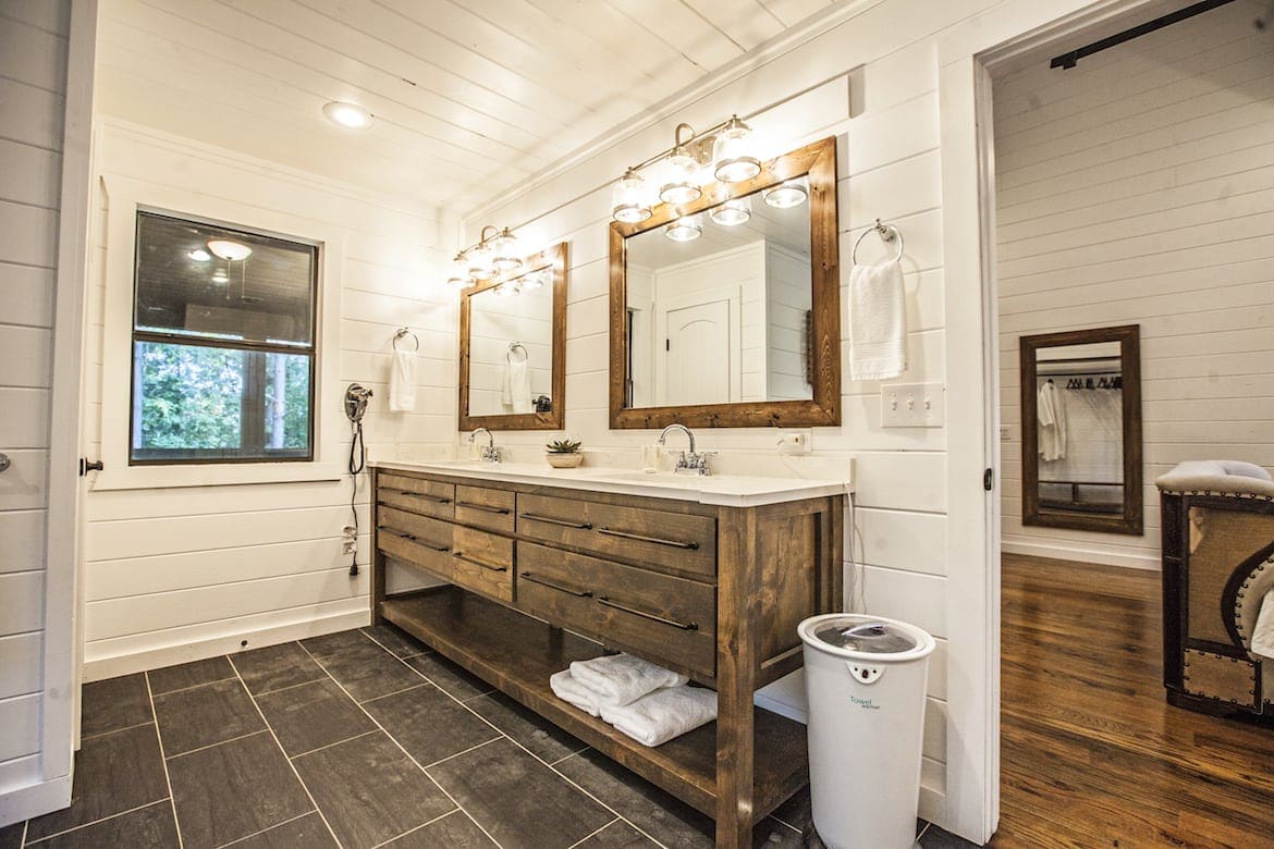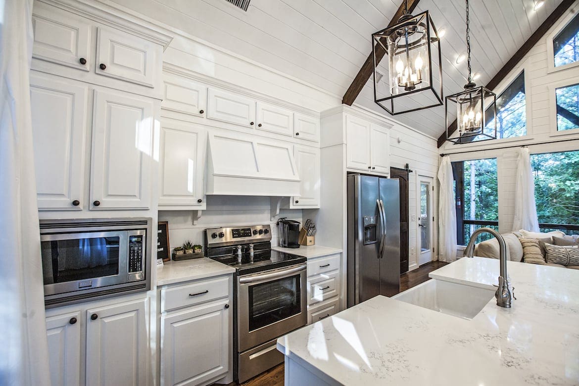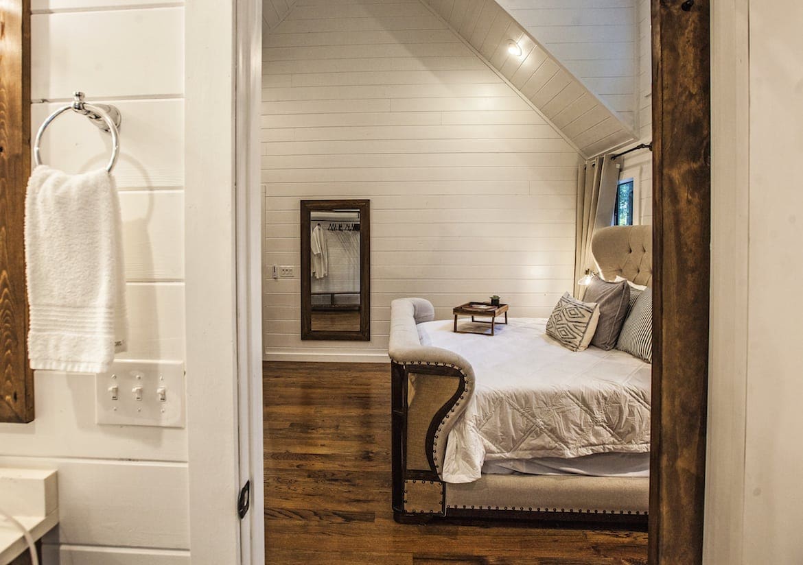 The Caroline 1 BR/Sleeps 4/1 King/1 Inflatable Mattress/1 Bath. The Caroline is the ultimate luxury retreat, with no detail overlooked. This hillside cabin makes a perfect romantic getaway for two, or a nice retreat for small families. Ten-foot ceilings and oversized windows feature hillside views and bring the outdoors right into the living areas. The natural wood beams and shiplap are inspired by the modern farmhouse movement and provide a relaxing and romantic atmosphere. The master bedroom features a king size bed, vaulted ceilings, and a walkout to the covered deck. An oversized bed with luxurious textiles makes this the perfect spot to read a book or watch a movie. The sleek bathroom offers a private oasis with a large walk-in shower featuring dual showerheads and an oversized soaking tub. Our spacious outdoor patio is located off the master bedroom with access from the living area as well. At 15 feet above ground level, the patio overlooks the hillside and pine trees. The patio is equipped with a large hot tub, beautiful stone gas fireplace, lounge, dining, and grilling areas. Below the deck is an area for lawn games and a wood burning fire pit perfect for smores. The cabins' location and long entry drive provide plenty of privacy for your ultimate getaway. This smart cabin features voice-controlled lights and thermostat, a digital cabin guide powered by Amazon Echo. State of the art 4K ultra high-definition TVs with surround sound and streaming services in both the master bedroom and living area are perfect for movie nights or sporting events. • NO PETS • NO SMOKING